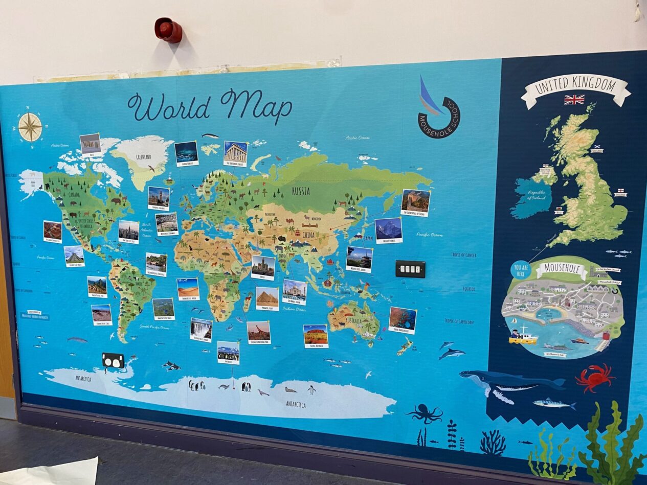 Die grafika het drie groot kaarte ingesluit; een van die omgewing rondom die skool wat nabygeleë landmerke uitgelig het, ‘n ander ‘n VK-kaart wat plekke van belang en belang aandui, en die derde ‘n wêreldkaart met poskaartfoto’s van bekende besienswaardighede. ‘n Vierde grafika was ‘n tydlyn wat belangrike historiese gebeurtenisse uiteensit.