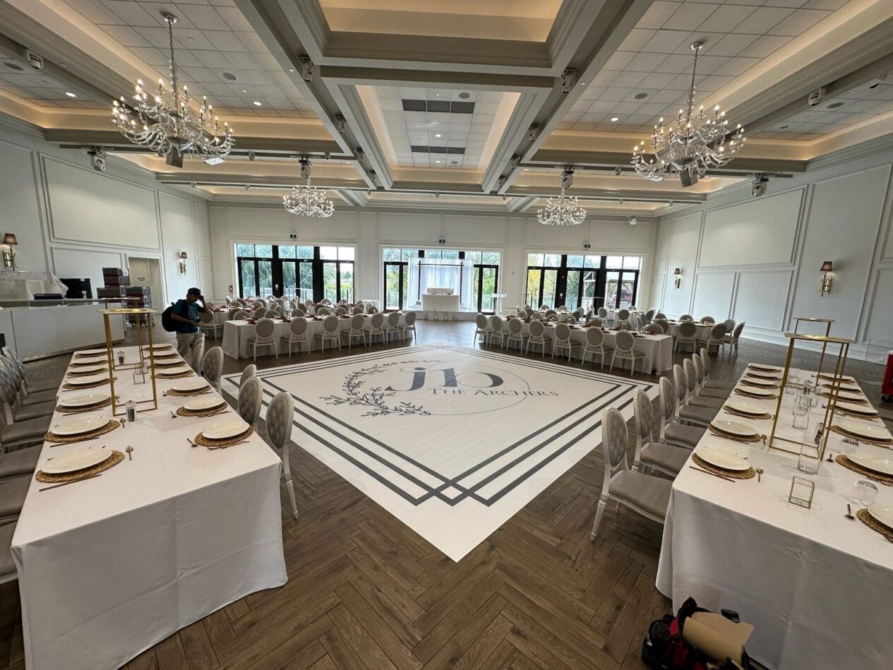 Die stuk het 20 voet x 20 voet gemeet en het ‘n swart-en-wit ontwerp gehad, kompleet met die voorletters van die bruid en bruidegom, saam met hul nou familienaam, die Archers. Ander aspekte sluit in ‘n gelynde rand om die rand van die dansvloer en ‘n groot grafika in die middel. Lamin-8 het alle grafika vir die toepassing intern gedruk met behulp van sy HP Scitex FB500-platbeddrukker.