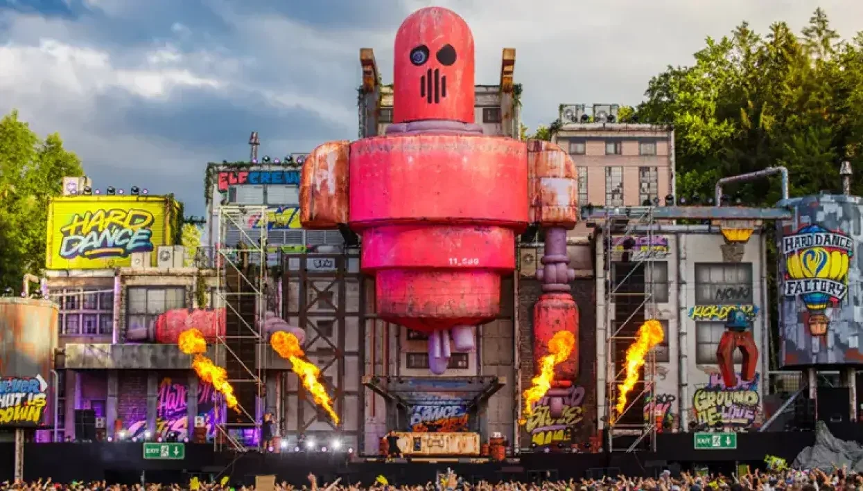 Revolution Event het die Hard Dance Factory ontwerp om soos ‘n verlate robotwerkswinkel te lyk waarin hierdie opblaasbare speelgoed die middelpunt was. Dit is op 195 gsm brandvertragende poliësterstof op ‘n Durst 512R LED-drukker gedruk en op ‘n Zund D3-snyer gesny. Die komponente is toe aanmekaar gewerk om die voltooide opblaasbare speelgoed te vorm. Hierdie benadering bied ‘n volhoubare alternatief vir die massiewe hoeveelhede polistireen wat voorheen vir stelle by feeste gebruik is.