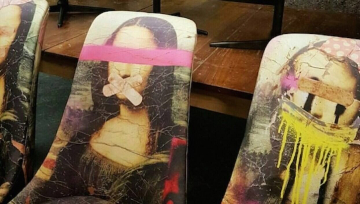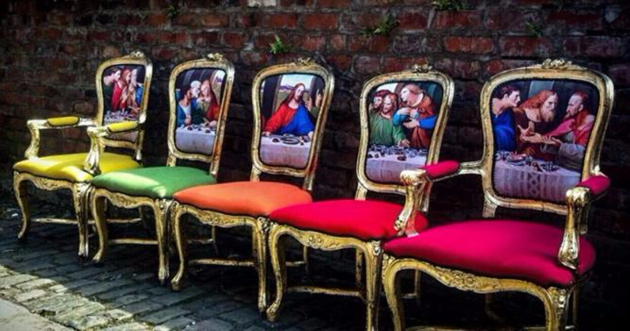 Kyk na hierdie pragtige versameling retro-stoele wat hergebore en verjong is met behulp van 'n pragtige digitaal gedrukte herweergawe van die ikoniese Mona Lisa.
