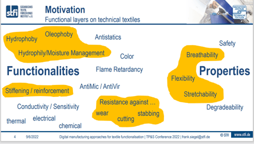 Frank het meer as 13 jaar lank die kompleksiteit van funksionele drukwerk bestudeer en gedurende die afgelope 7 jaar het hy gefokus op tekstielfunksionalisering deur drukprosesse. Frank het beskryf hoe beide digitale en kontaklose vervaardigingsmetodes tegnologie vir hulpbronbesparende produksieprosesse moontlik maak. In vergelyking met skermdruk, kan digitale druktegnologieë funksies toepas wat op maat gemaak is, kontakloos en op 3D-tekstieloppervlaktes is. Frank voorspel in die toekoms dat digitale tegnologieë soos UV-laserbeelding, druppel-op-aanvraag-drukwerk en enkelmondstuk-straaltoediening tot nuwe ontwerpmoontlikhede en -funksionaliteite sal lei.
