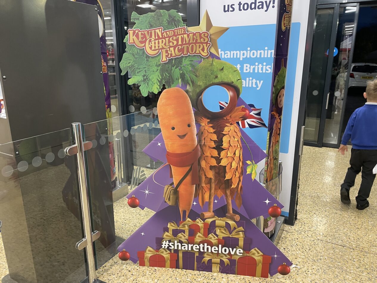 Řetězec supermarketů Aldi vyrobil tento speciální kousek, který má pomoci zabavit mladé lidi při nakupování s rodiči. Děti mohly prostrčit hlavu otvorem na kartonu, aby to vypadalo, že stojí vedle vánoční postavičky Aldi, mrkve Kevina!