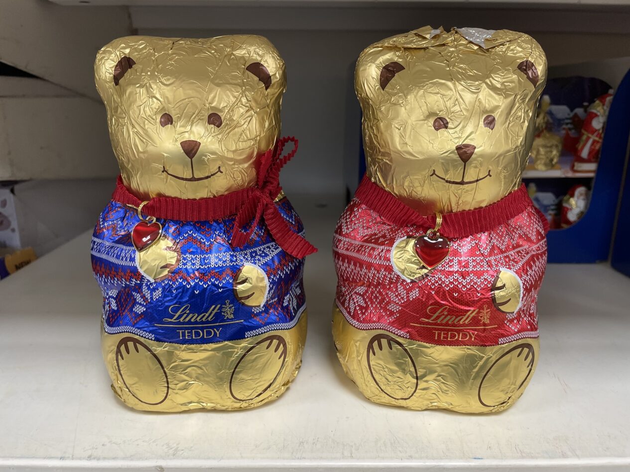 Lindt se vrací na náš seznam s tímto poutavým potiskem fólie. Fóliový obal byl důmyslně navržen tak, aby vypadal, že slavní čokoládoví medvědi mají na sobě vlněné vánoční svetry!