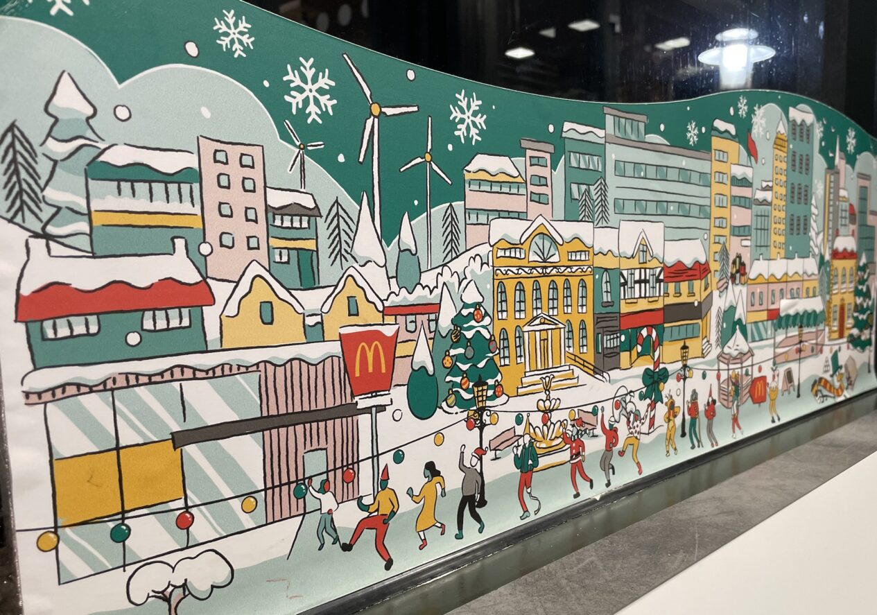 Zpět do McDonald’s a tento řetězec rychlého občerstvení letos přenesl téma ze svých obalů na další povrchy. Stejný design, který se objevil na kelímcích, se objevil také na grafice na oknech, která byla instalována v provozovnách po celé Velké Británii a zobrazovala slavnostní zasněženou scénu.