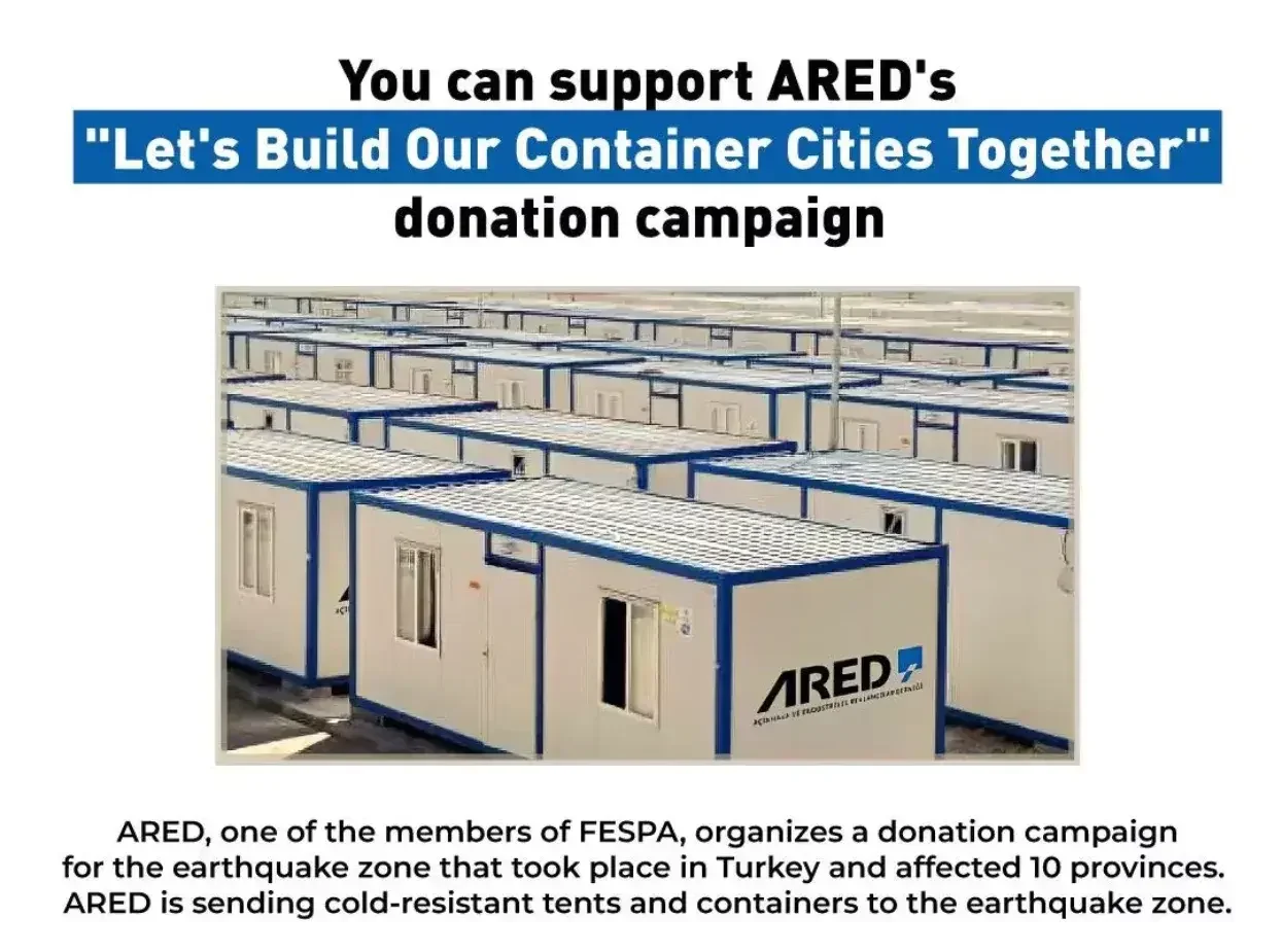 Díky darům od FESPA, jeho celosvětových asociací a členů sdružení ARED dosud zakoupila 10 stanů a instalovala je v nejvíce postižených oblastech, aby poskytla krátkodobé přístřeší. Další dary jsou využívány k nákupu jednotek, které budou upraveny tak, aby poskytovaly dlouhodobější ubytování vhodné přibližně na dva roky, dokud nebude k dispozici nové bydlení. Ty budou umístěny ve městě dočasného bydlení, které zřídila turecká organizace SEDEFED (Sectoral Associations Federation) zastupující více než 12 000 podniků, jejímž členem je i ARED. ARED rovněž navrhne, vyrobí a daruje směrové značení pro tři dočasná bytová městečka, která SEDEFED zřizuje v Adiyamanu, Hatay a Marasu.