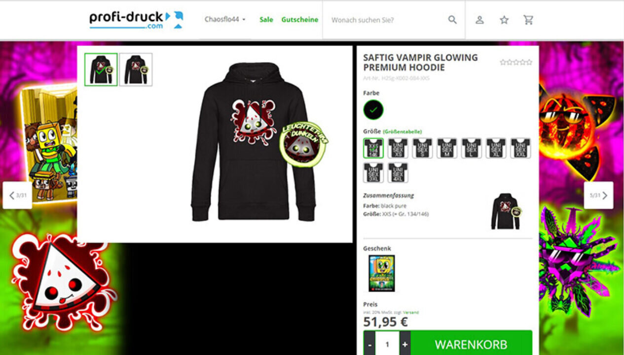 Mit einem Einzelpreis von über 50 Euro ist der Juicy Vampire Glowing Premium Hoodie“ aus der aktuellen Kollektion von ChaosFlo44 nicht gerade billig. Der österreichische Minecraft-YouTuber hat fast 1,5 Millionen Abonnenten. Sein Online Shop wird seit 2016 von der sanDAM GmbH betrieben. Das Unternehmen stellt die meisten Produkte vor Ort in Absdorf her, einer kleinen Stadt 1 Stunde von Wien entfernt. Neben dem digitalen Direkt- und Sublimationsdruck bietet die sanDAM GmbH auch Effektfolien und Stickereien an.