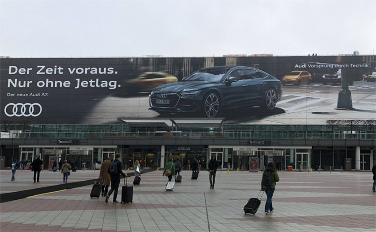 Purpose: The wide format Audi billboard advertises their latest sports car at the main entrance of Munich airport Terminal 2.