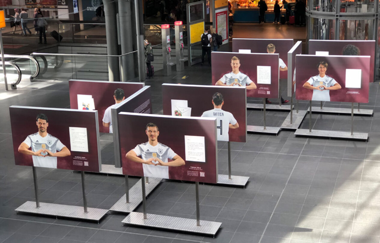 Purpose: These billboards were part of an exhibition at the entrance of Berlin’s main train station in 2018. It showcases friends and relatives of the German football national team who express their solidarity with the players and wish them good luck.