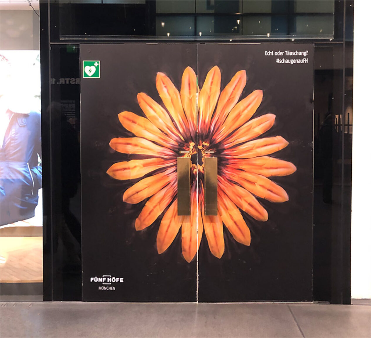 Purpose: This wrapped glass door was used to advertise the Exhibition “Die Lust der Täuschung” at Kunsthalle München from November 2018 to January 2019 at the Fünf Höfe Premium Mall where the museum is located.