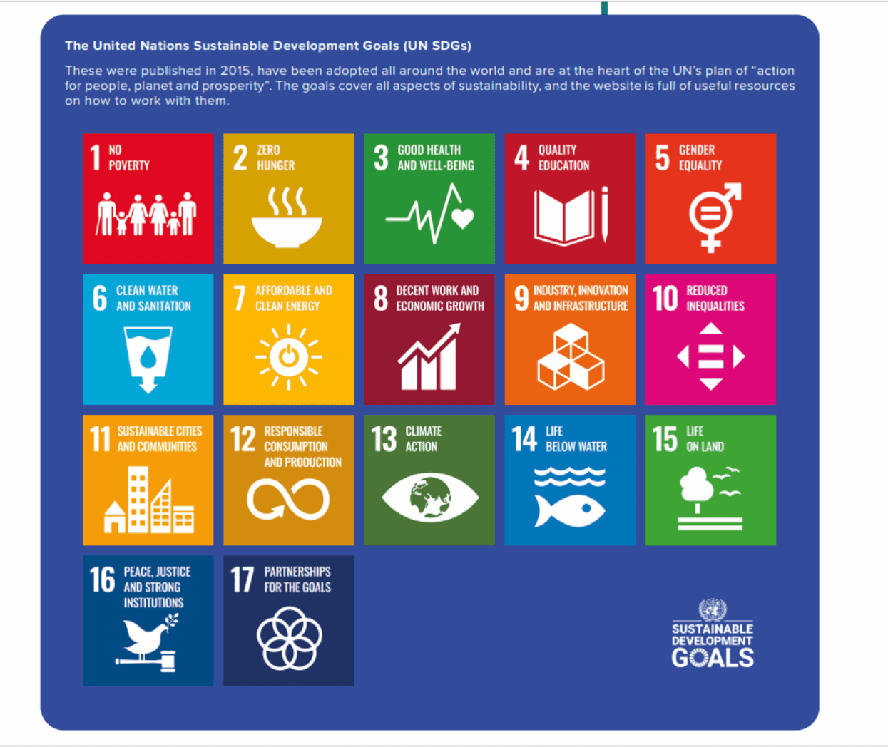 The United Nations Sustainable Development Goals (UN SDGs) were first published in 2015 and cover all areas of sustainability that focuses on peace and prosperity for people and the planet, now and further into the future. For more information on the UN SDGs including yearly progress reports and Global Sustainable Development Reports please visit here.