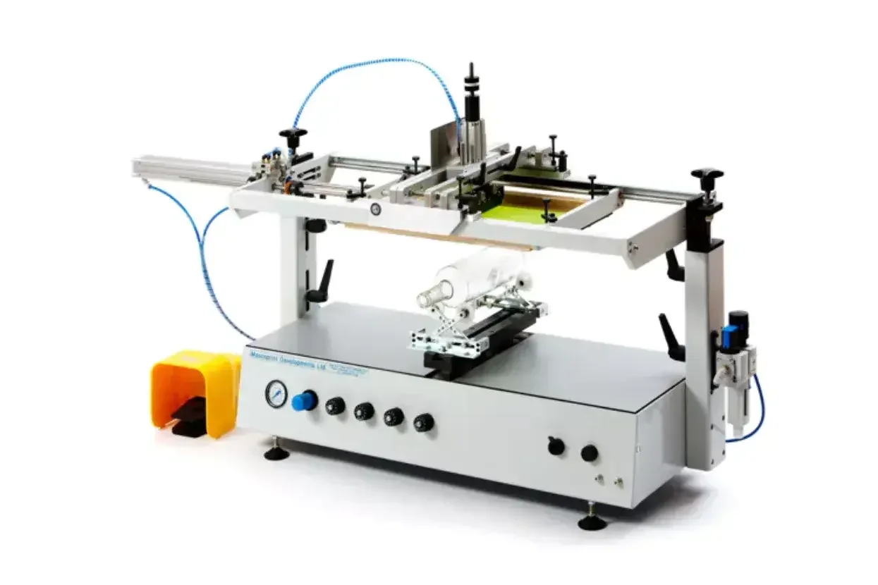 The British company MascoPrint, which is based in Hertfordshire, makes the CP12 bench-top semi-automatic screen printer that’s designed for printing to cylindrical objects. It uses interchangeable jigs to hold the objects in place which allows it to handle a huge range of products, including smaller items like pens and thermometers as well as plastic bottles and alloy cans up to fire extinguishers. Mascoprint will also make customised jigs for specific purposes, such as pipes and tubings and has had considerable success in automotive, medical and other industrial areas. It has a single screen printing station and can produce prints up to 254mm in length and 203mm wide. It runs off air pressure and is operated by a foot control. There is an option for handling flat objects but it’s not really designed for that type of work.