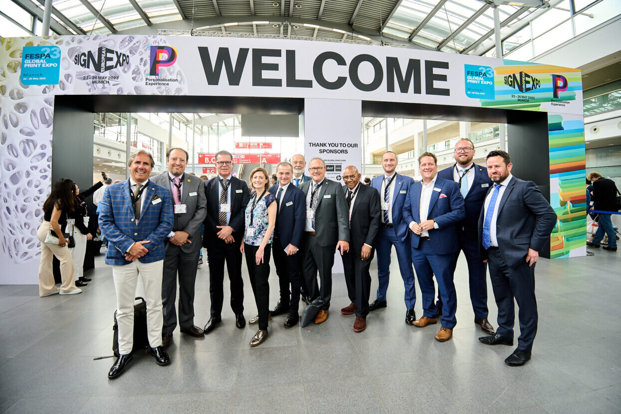 Caption: “Welcome” signage featured at FESPA Global Print Expo 2023 in Munich, Germany was created by Insite Graphics. The arch was constructed using reusable aluminium frames with dye sub printed fabric. After the exhibition all materials that Insite Graphics used were returned to the UK to be reused and recycled. Credit: FESPA.