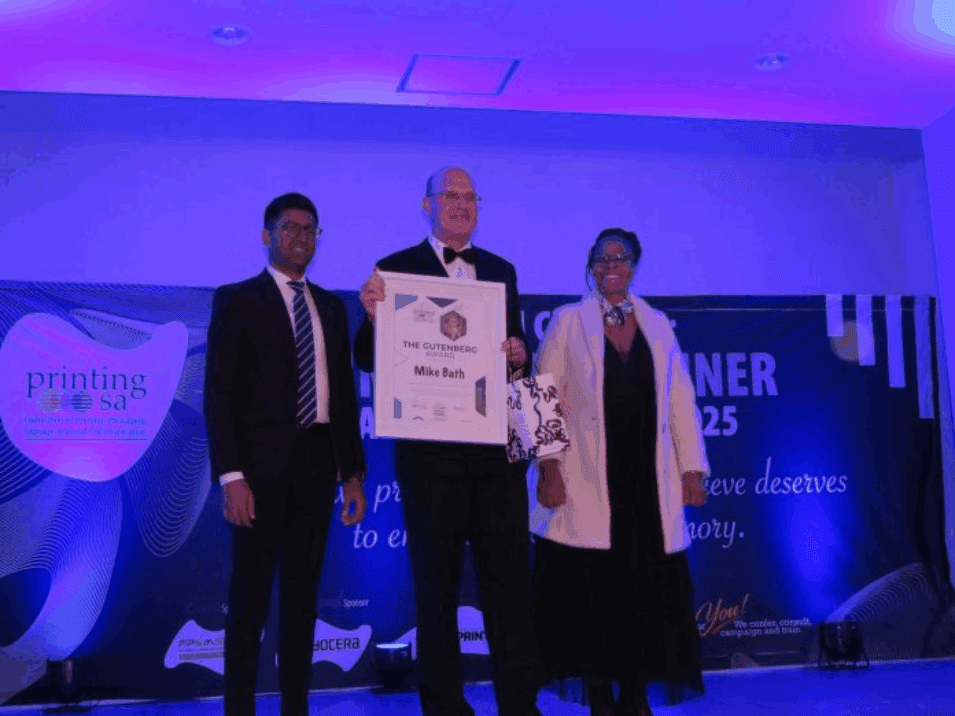 The prestigious Gutenberg Award was presented to Mike Bath, Managing Director at Marshall Hinds (Pty) Ltd, for his outstanding contribution to the industry.