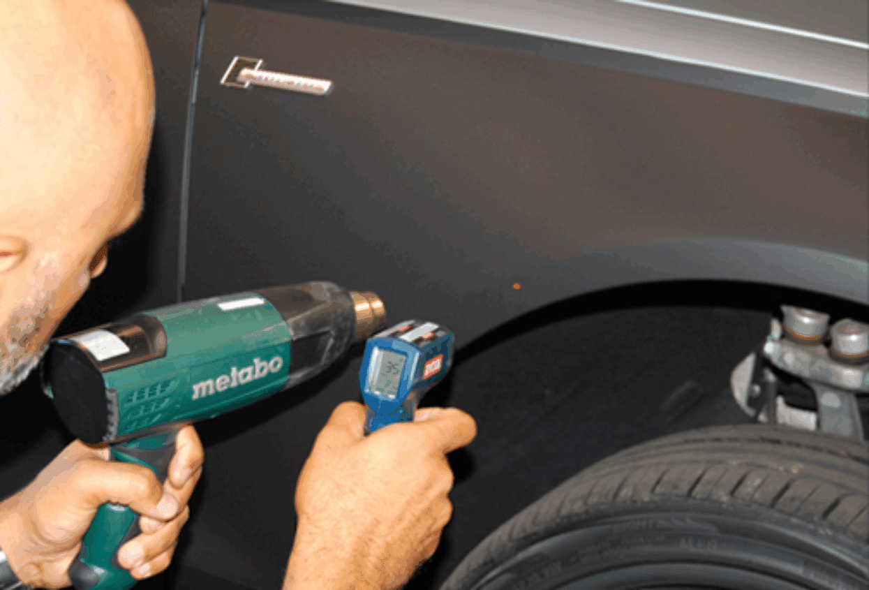 The installer, now using a Heat-Gun (not a torch), must go over the areas of the wrap that is on a recessed or curved area, using digital thermometer to ensure every inch of these areas reaches a certain degree as required by the manufacturer. (Solid color wrap needs to reach a 45 to 50 degrees Celsius and printed media must reach 85 to 90 degrees Celsius).