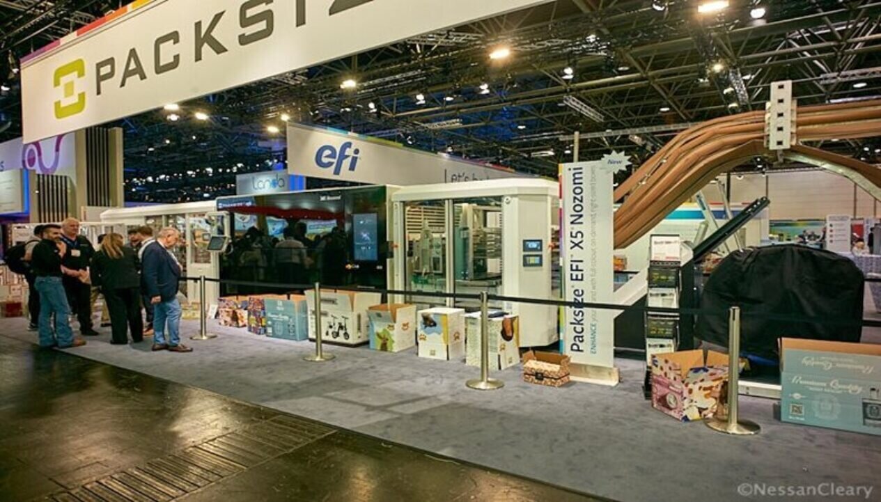 EFI used the recent Drupa show in Germany to introduce a dedicated box making solution called the Packsize Nozomi X5. This is a complete printing and converting line that can take in blank corrugated substrates from four Z-fold supply feeders, print and then form a complete box, all in one line for an integrated on-demand box printing solution. Every box can be a different shape and size, with up to 30,000 possible choices. The boxes are output to a conveyor belt that’s fitted with a label print and apply unit, so that shipping details and hazard labels can be automatically applied to the box.