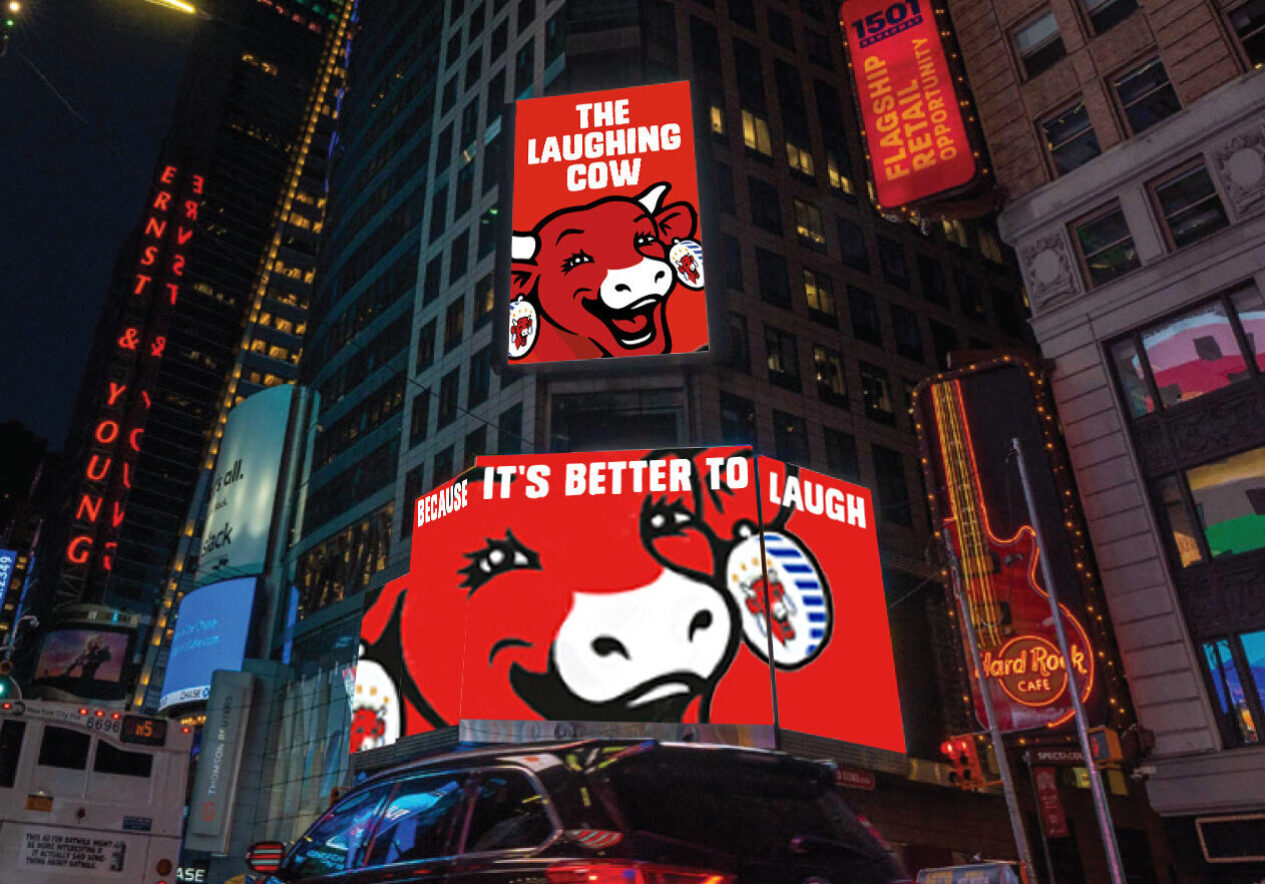 Description : La marque mondiale de fromage à pâte molle La vache qui rit a célébré le lancement de ses nouveaux quartiers de fromage avec une campagne qui comprenait une exposition numérique à Times Square. Le logo emblématique de La vache qui rit a illuminé un certain nombre d’écrans sur le célèbre site new-yorkais.