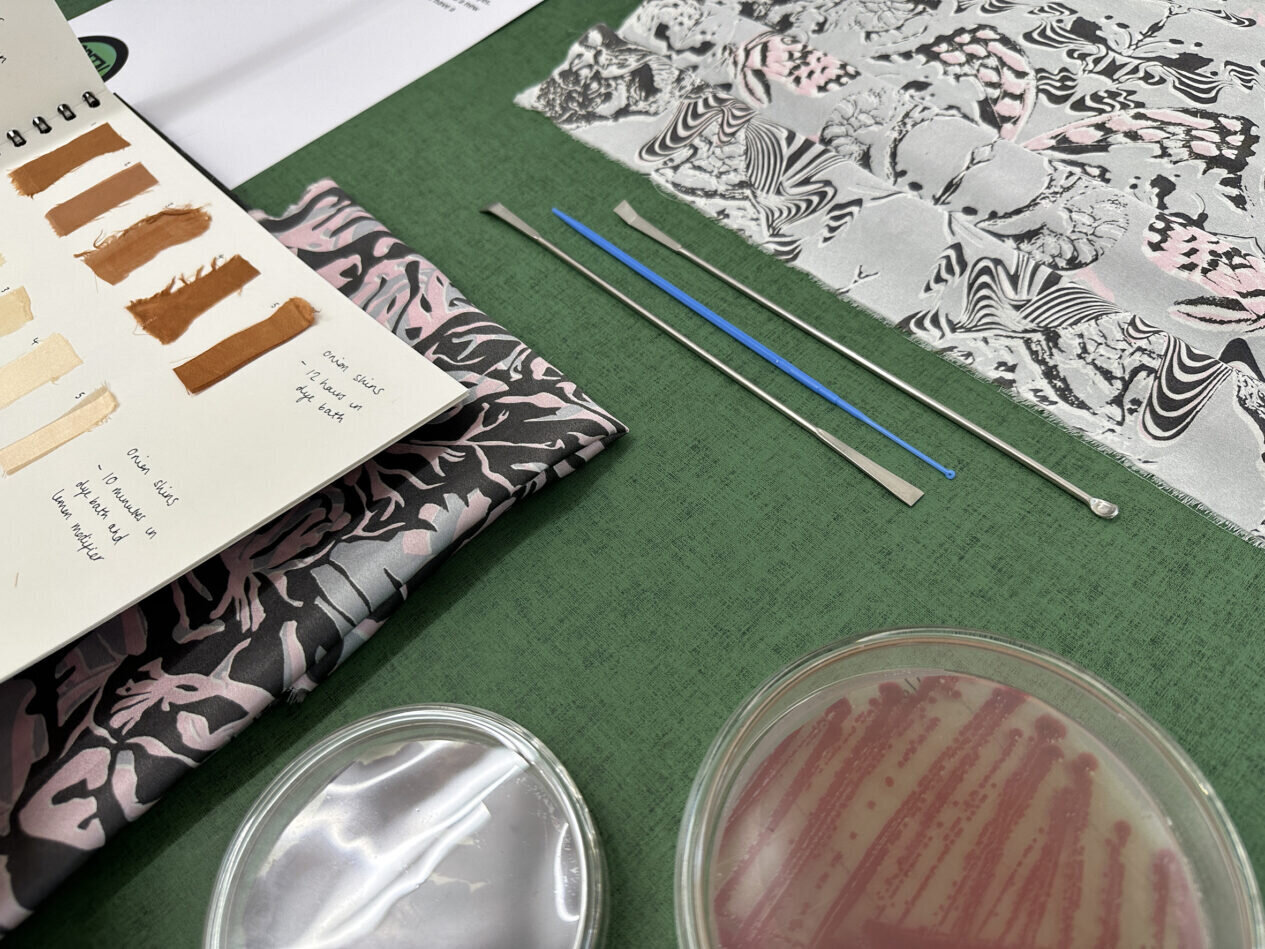 Ezután a Morris által inspirált mintát hagyományosan blokkra nyomtatta a szövetre, de a hagyományos festékeket pigmenttermelő baktériumokkal helyettesítette.