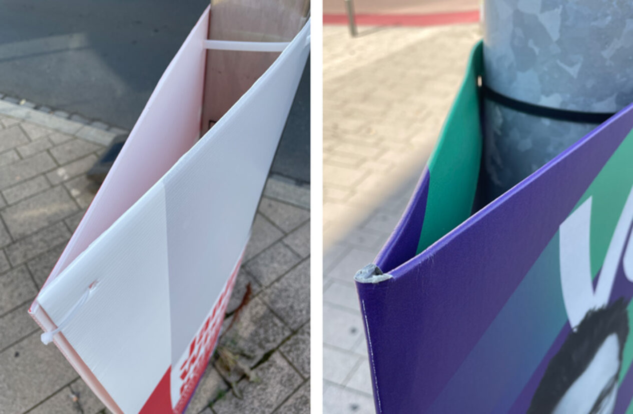 2020年のドイツ連邦総選挙では、各政党が異なるアプローチを選んだ。紙ベースの段ボールポスターを使う政党もあれば、昔ながらの紙ポスターをAボードに糊付けして掲示する政党もあった。また、段ボール製のプラスチックを使い続ける政党もあった。もちろん、ロジスティクスなど考慮すべき要素が数多くあるため、どの選択肢が本当に環境負荷が低いかを判断するのは難しい。
