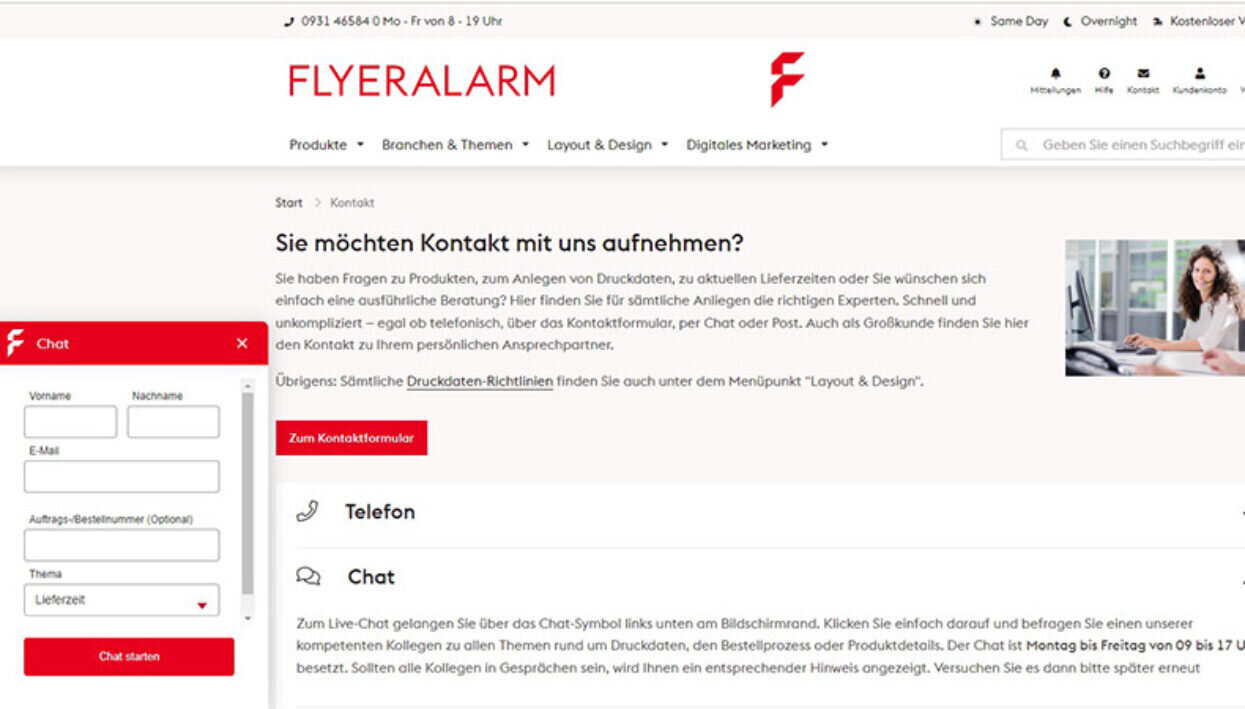 Os chatbots ou software de conversação como o Zen Desk são bastante comuns em serviços de impressão online de maior dimensão, como o Flyeralarm, mas são normalmente concebidos para eliminar o fardo de pedidos bastante normais do pessoal do serviço de assistência. As gráficas com muitos projectos individuais consideram frequentemente que visitar os clientes é uma parte importante da atividade do seu departamento de vendas, o que leva a longas viagens de carro.