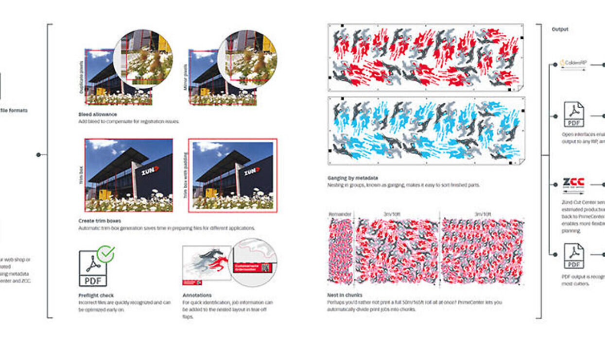 O PrimeCenter também ajuda a manter os trabalhos organizados, utilizando metadados como o tamanho, a colocação ou a ordem de impressão. O software pode produzir para qualquer RIP/impressora e qualquer cortadora devido à interface aberta do PrimeCentre. Permite a integração com o Zünd Cut Server e com o Cut Time Estimation, tornando o processo de automatização do LFP mais eficiente.