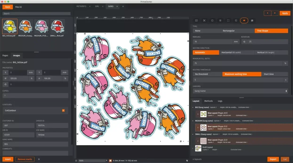 Legenda: A capacidade de agrupar ou encaixar eficazmente vários trabalhos na mesma folha deverá permitir poupar dinheiro ao minimizar o desperdício de suportes, como se vê aqui no PrimeCentre da Caldera.